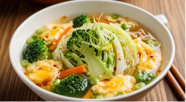 ふわふわの卵とともに、ブロッコリーの茎やキャベツの芯を無駄なく味わう中華風スープ。