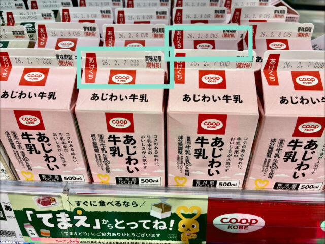 たとえば、このように牛乳が並んでいて、手前が「2月7日」で、奥に「2月8日」のものがあれば、すぐに使うのであれば、手前の「2月7日」のものを買う、ということです。