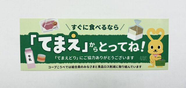 田畑さん:これは、お客様(コープこうべでは「組合員さん」とよびます)に「てまえどり」を呼びかけるためにつけているものです。「てまえどり」とは、すぐ食べるのであれば、お店の棚の手前にある、賞味期限や消費期限が近い商品を取って買う、という取り組みです。