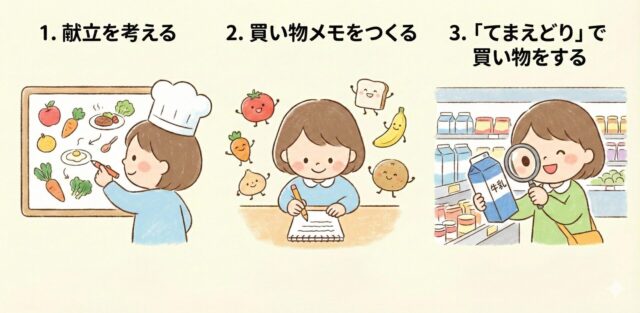 たとえば、「夕食にカレーを作る」と決めたら、「何が足りないかな?」と、家にある材料をチェックしよう。そして、足りないものをメモして、お店へ行くんだ。メモを見ながら食材を探して、賞味期限や消費期限を見ながら「てまえどり」で、カゴに入れよう。