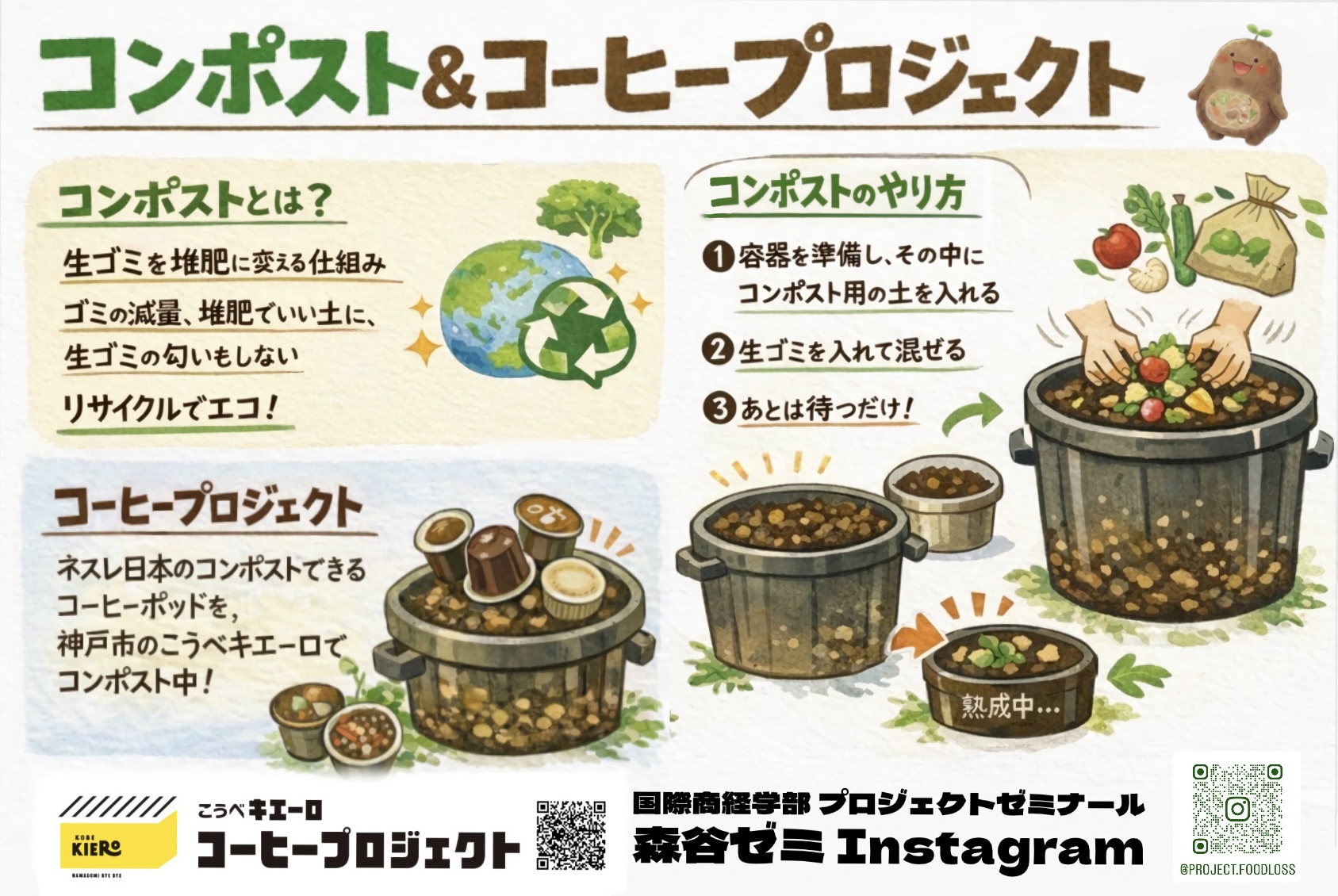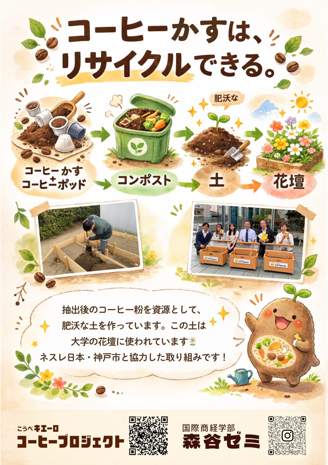 今年度は新たな試みとして、ネスレ日本株式会社、神戸市環境局と連携した、「こうべキエーロ コーヒープロジェクト」が始まりました。コンポストでコーヒー抽出後に残ったコーヒーかす(以下、コーヒーグラウンズ)を分解し、その土を花壇に使用して循環させるプロジェクトです。