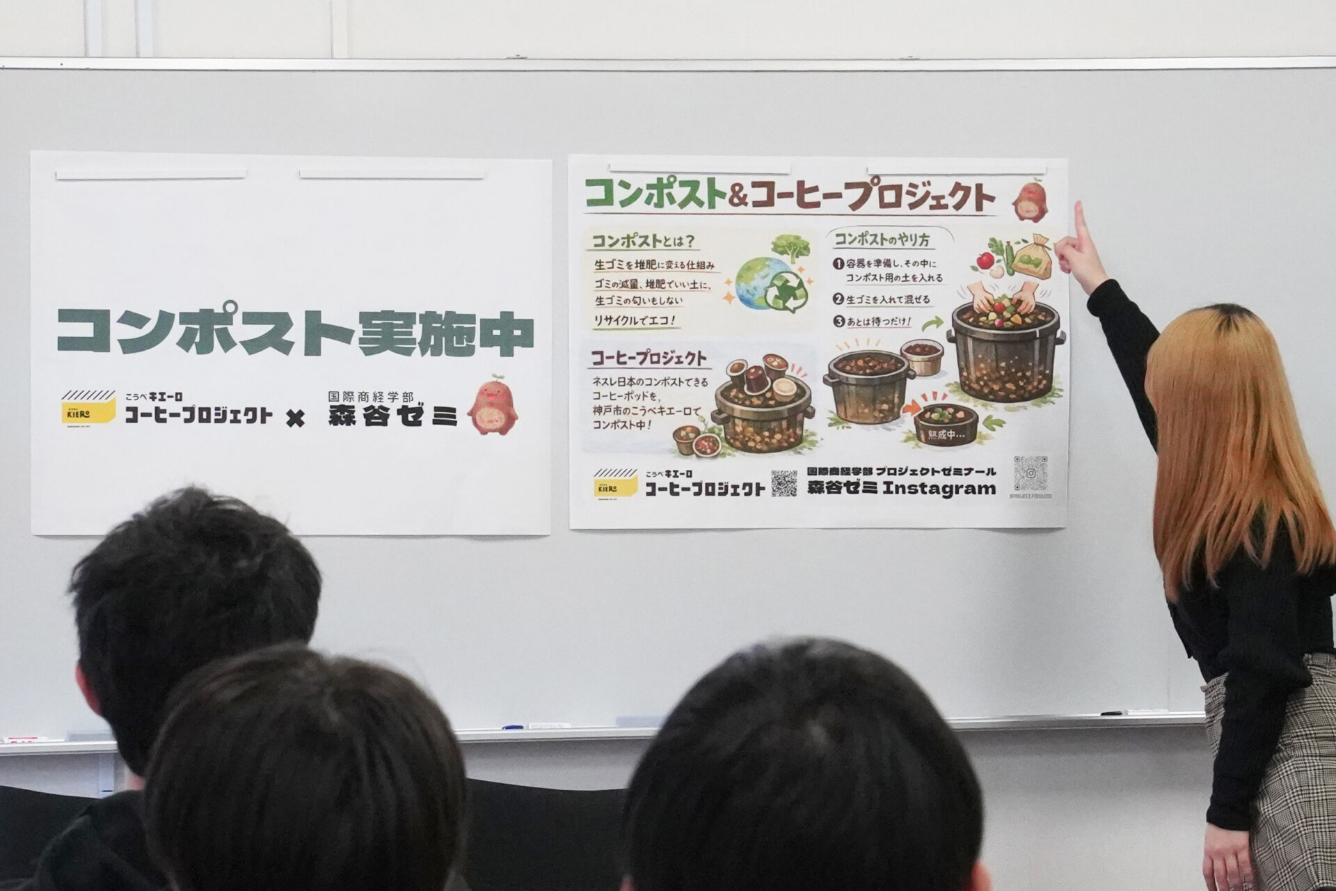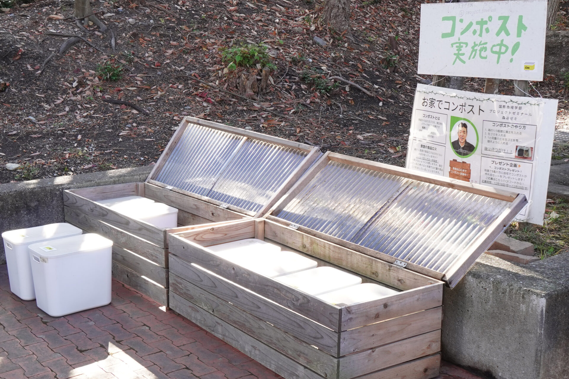 受講後、ゼミ生たちは「自分たちはコンポストのことをよく知らなかった。ということは他の学生たちも知らないのでは?」と仮説を立て、2班に分かれてコンポストの認知度向上を進めることにしました。キャンパス内へのコンポスト(キエーロ)設置を進める班と、SNSやイベントで啓発活動を実施する班です。