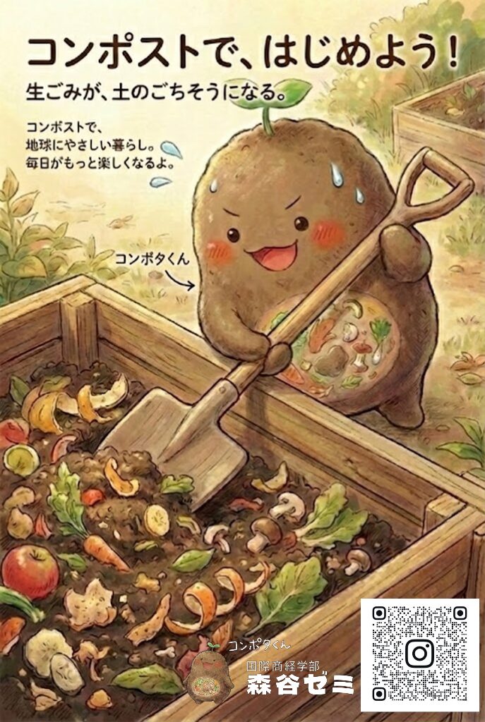 ゼミ2025年度後期のまとめは、コンポストに対する印象を変えるポスターづくりに挑戦。クスッと笑えて目に止まる工夫や、親しみを感じるキャラクターを使ったデザイン、活動を分かりやすく紹介したものまで、