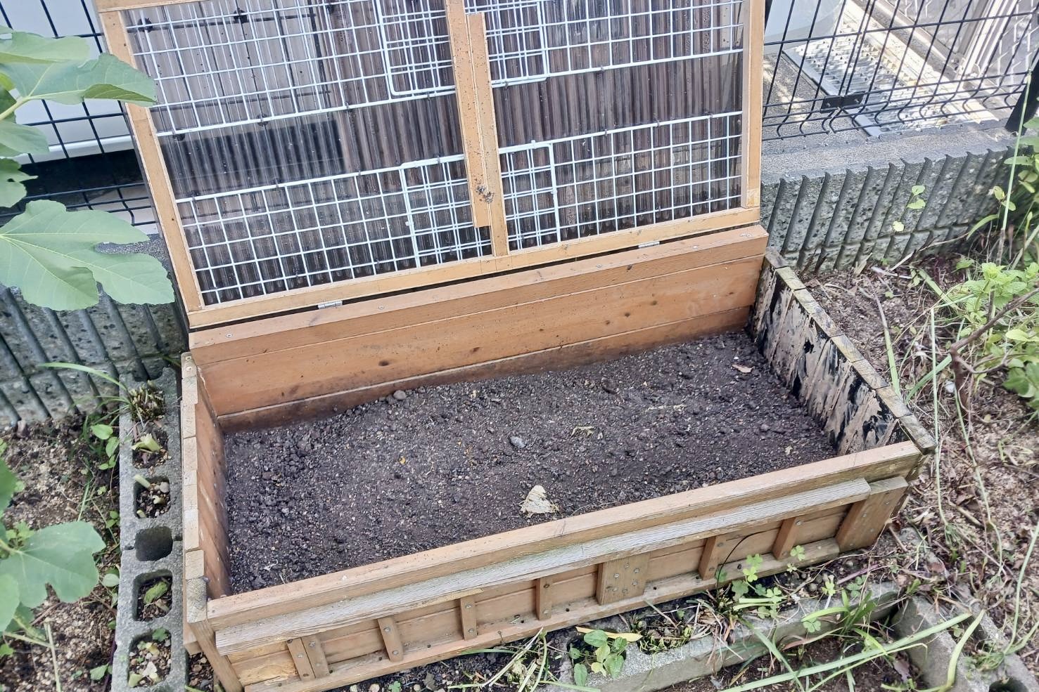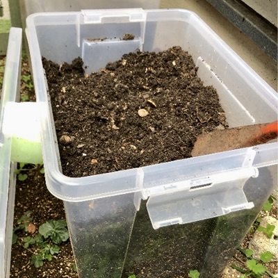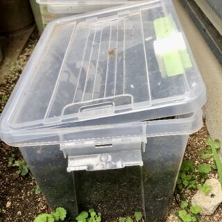 虫の侵入を防ぐ為にお古の洗濯ネットに土を入れ容器の蓋をずらして、その上に廃棄予定だった風呂の蓋を雨除けとして使用。
