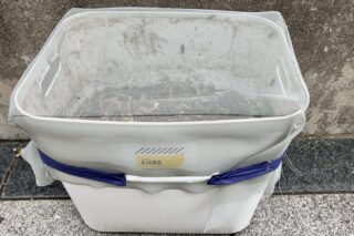 衣装ケースをキエーロ容器として利用。蓋の替わりに、100円ショップで購入できる大きい洗濯ネットを使用。