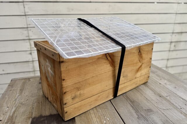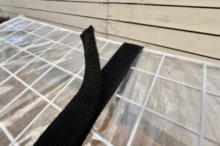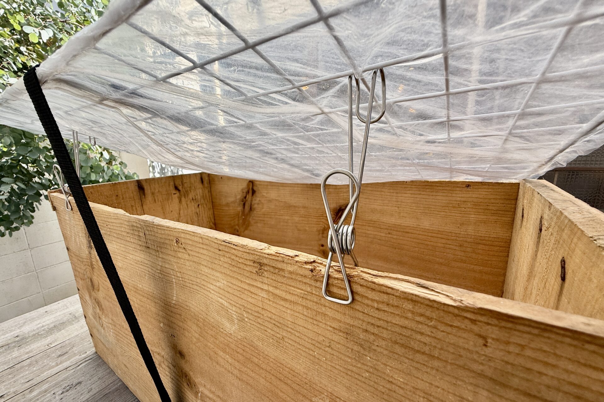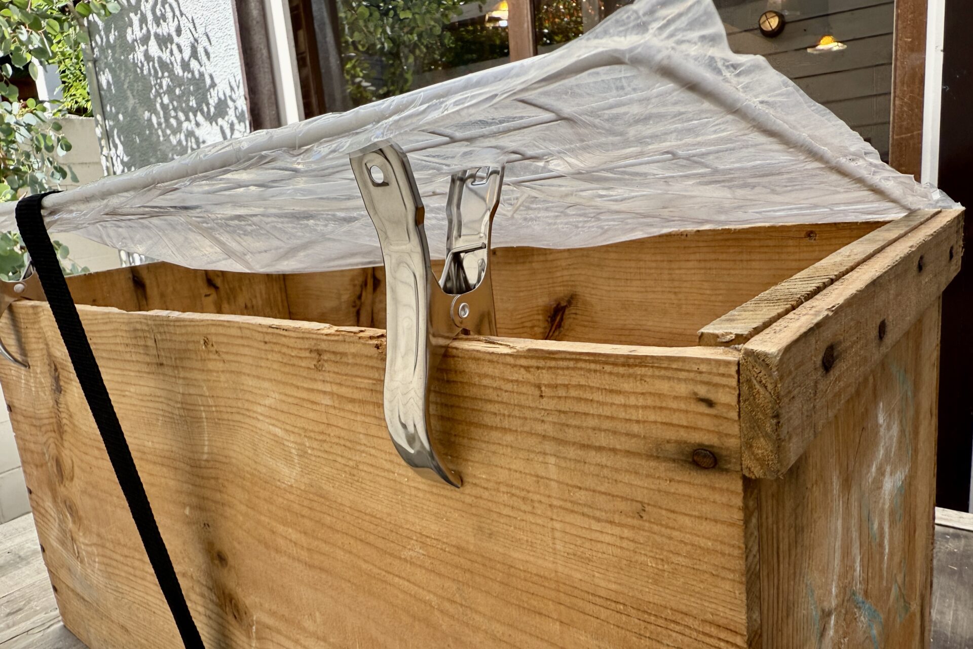 蓋が飛ばないようにマジックテープでりんご箱と蓋を巻き固定できるようにしました。