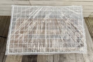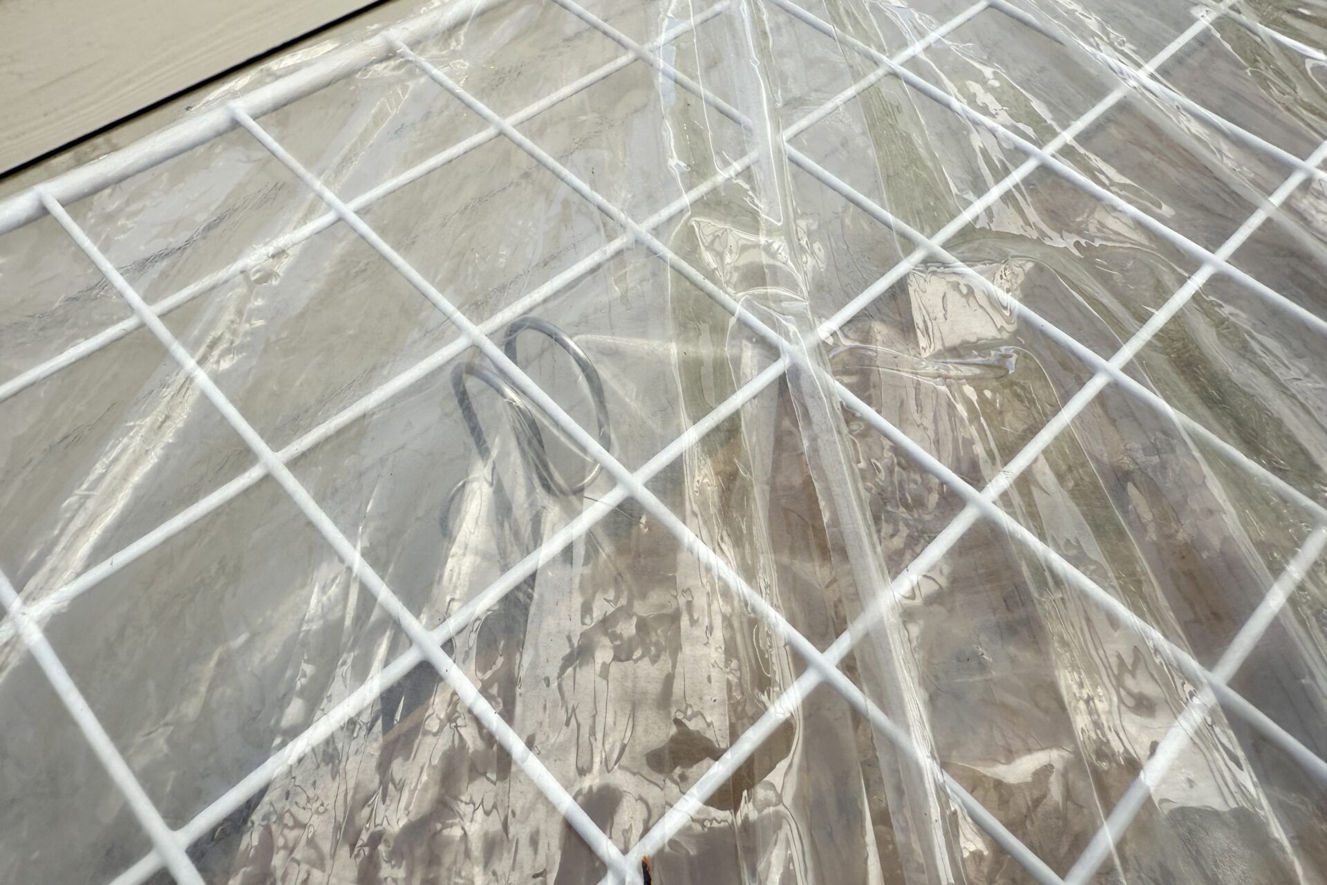 不要になった雨傘のビニールを剥がし、二つ折りにしてワイヤーネットを挟みます。