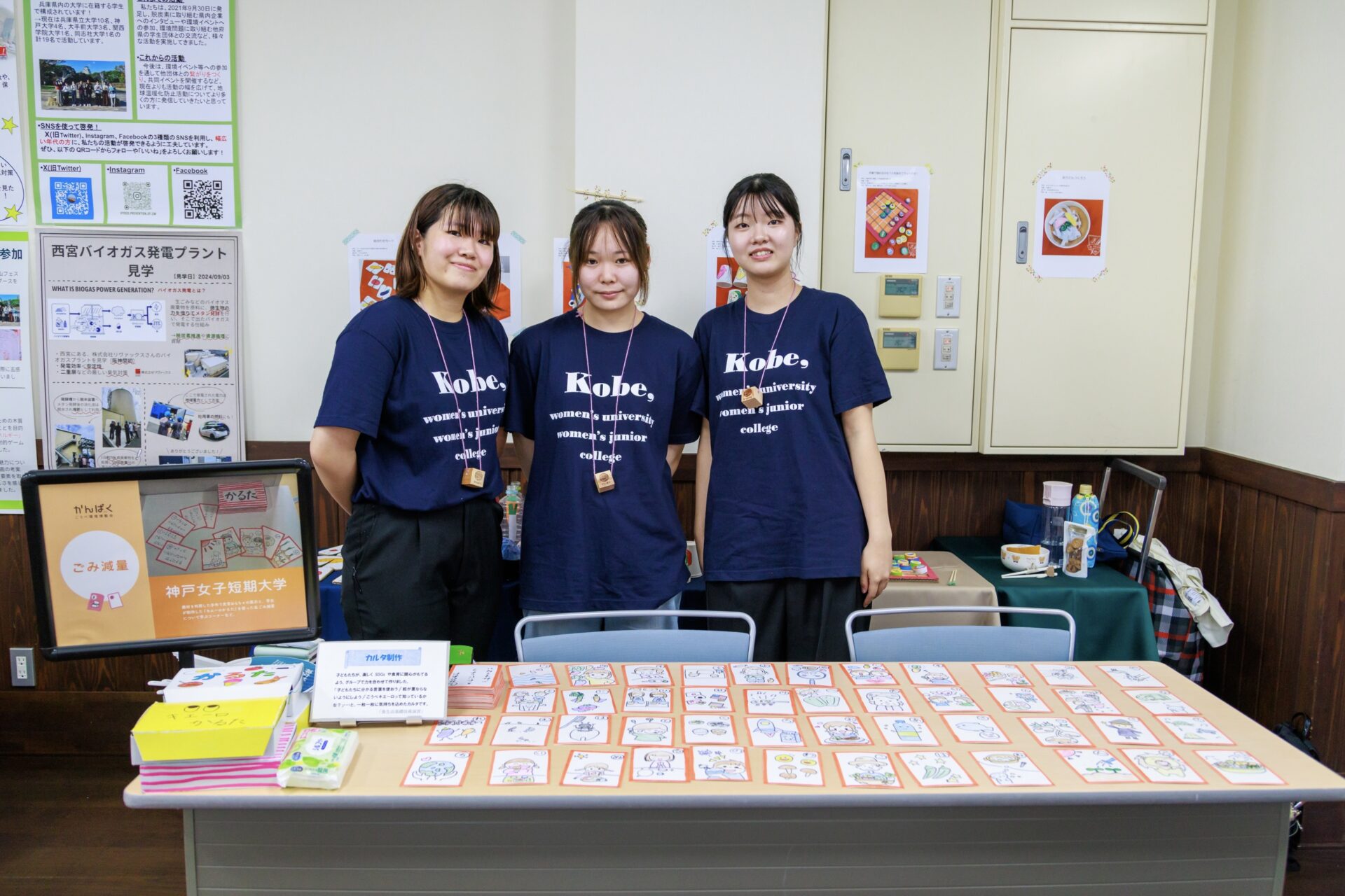 食物栄養学科2年生の棚倉さんは、2024年10月に長田区のふたば学舎で行われた「こうべ環境博覧会 かんぱく2024」に出展者として参加し、幼児教育学科の多留さんたちが作ったキエーロかるたを参加者に紹介する役割を担いました。ブースを訪れた参加者にかるたで遊んでもらったのだそう。子どもはもちろん、大学生や大人もかるたを楽しんだようです。
