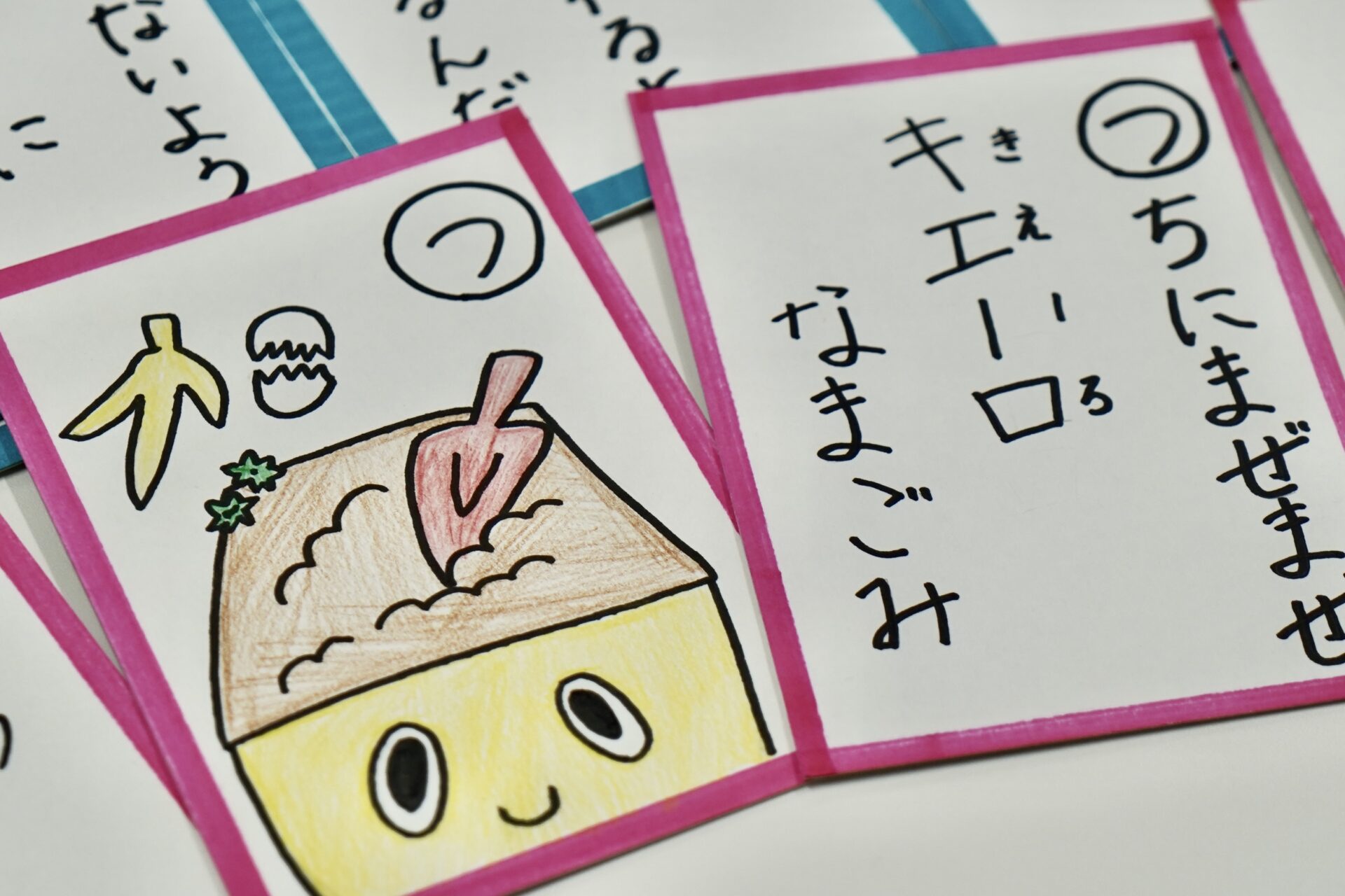 かるたで遊んだときはキエーロやごみに全く興味がなかったとしても、分かる年齢になったとき、「幼稚園で遊んだかるたの内容がこれなんや!」と記憶がつながってくれたらうれしいです。