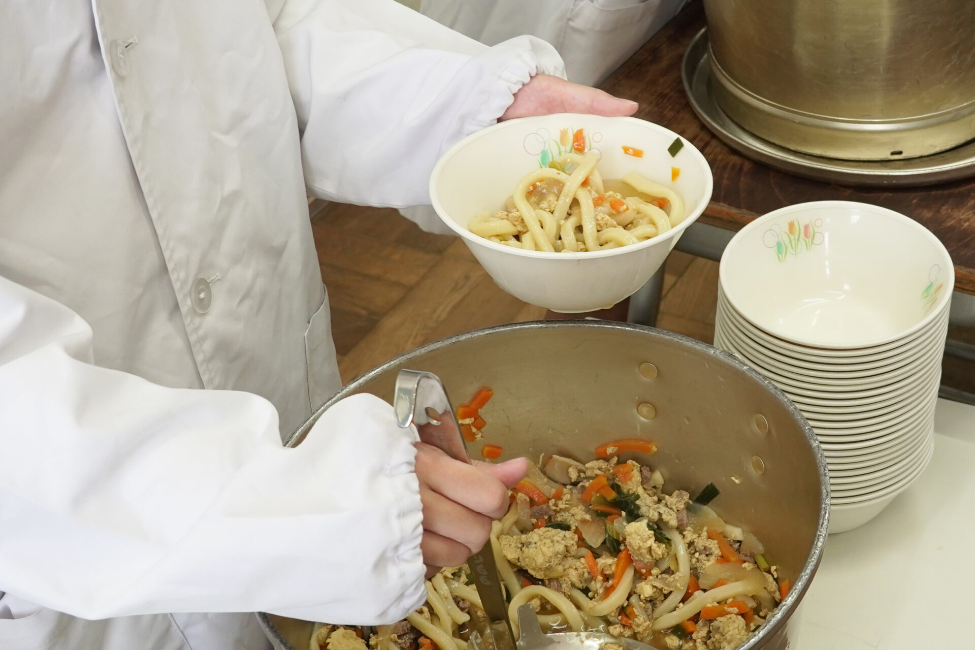 調理士の方々の協力で収穫野菜を給食食材に。
